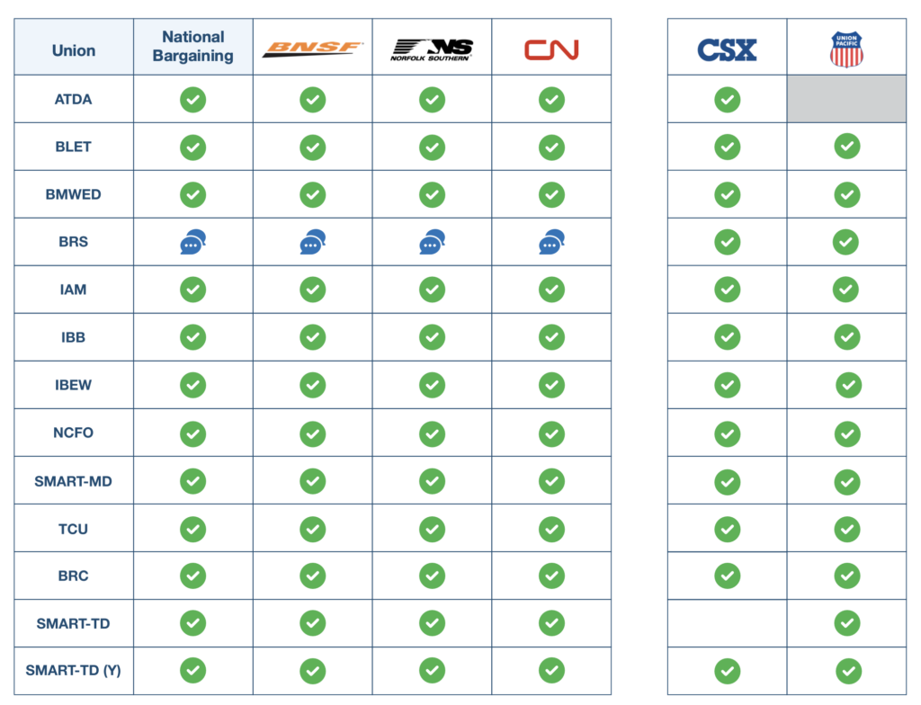 Learn more about the status of agreements between railroads and unions this bargaining round.